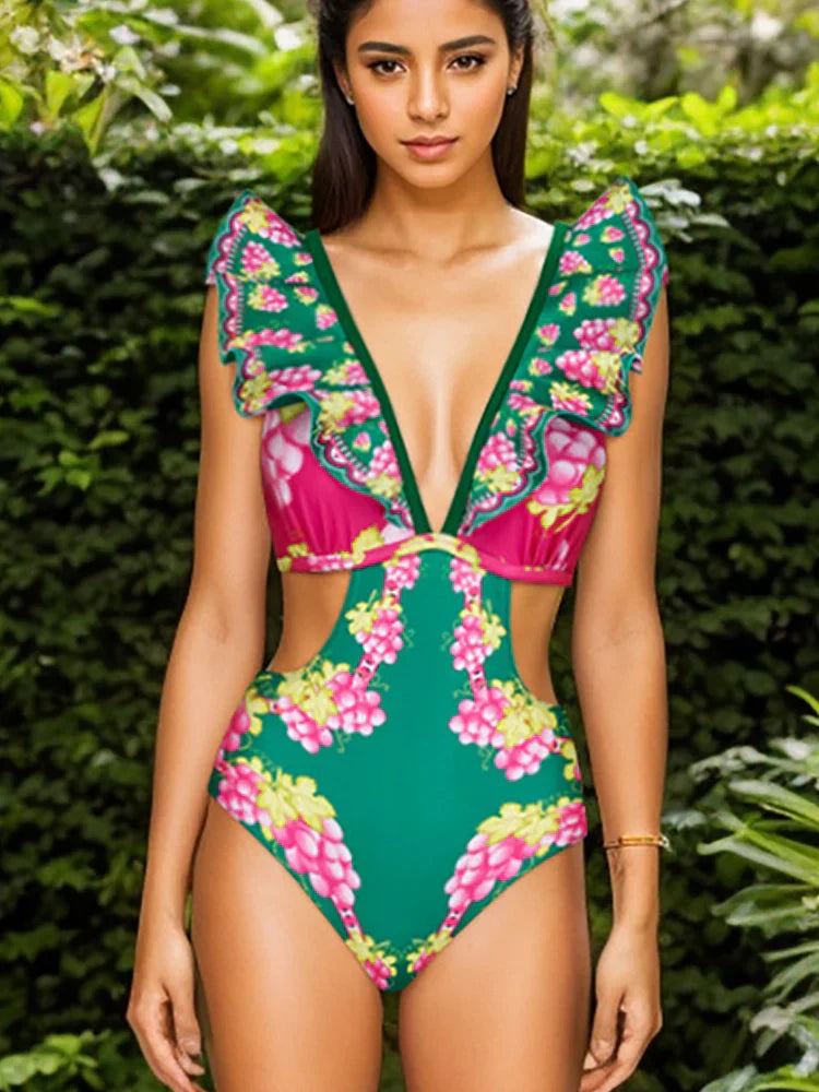 Romantic and effortlessly elegant, this set features a ruffled cutout one-piece swimsuit paired with a flowing maxi skirt. The soft curves and delicate details create a dreamy resort look perfect for your next escape.
