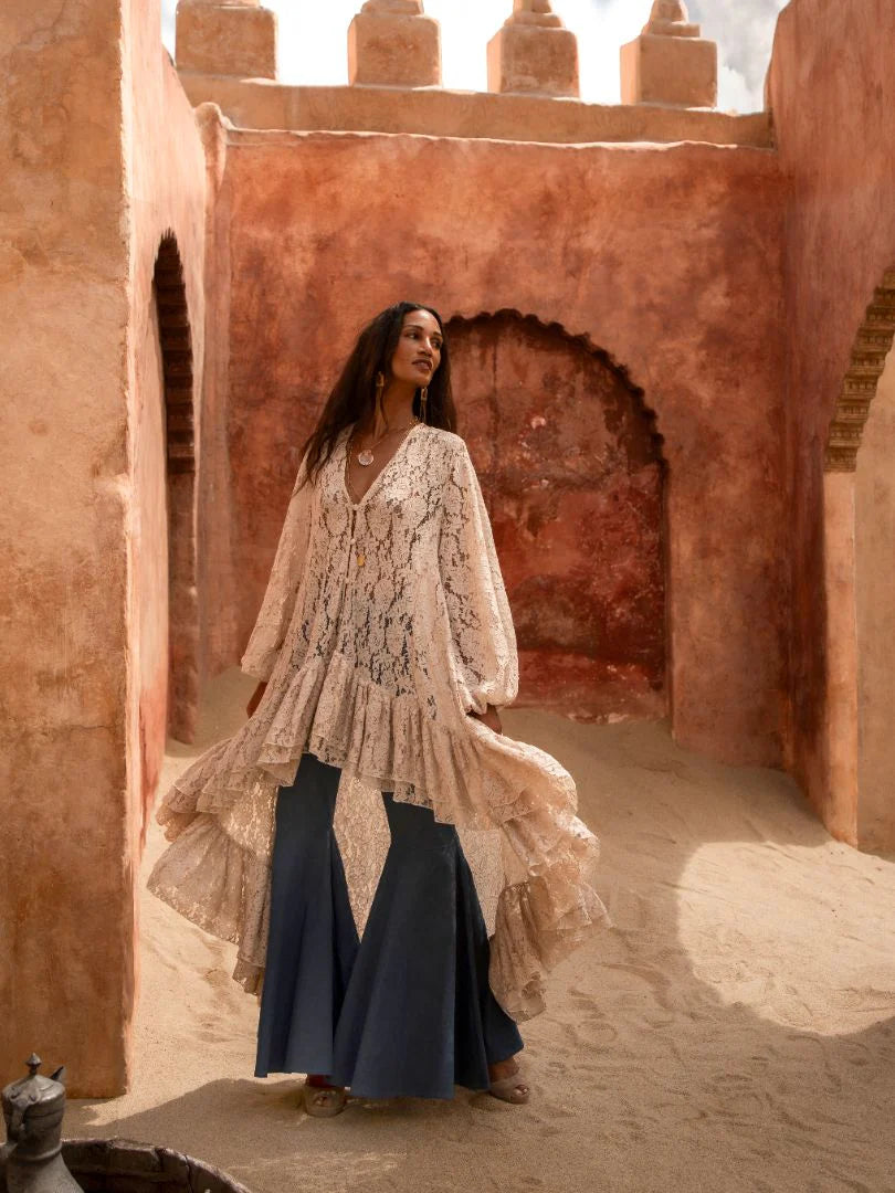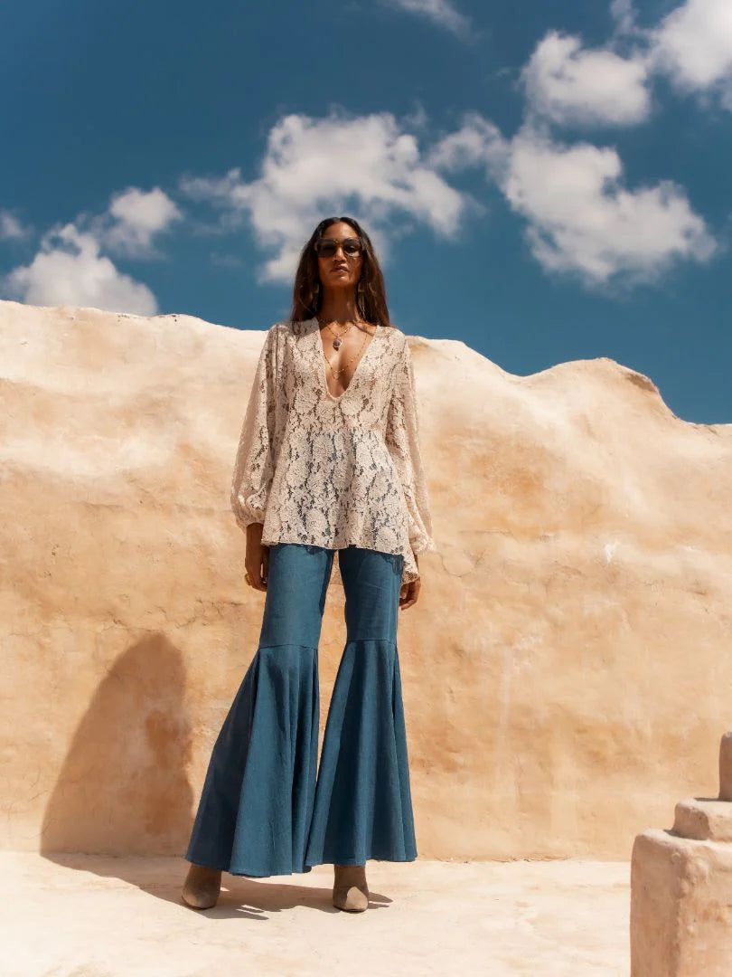 Echoing the effortless allure of vintage tailoring, these jeans reinterpret retro flair with modern precision. Cut to a high-rise silhouette that elongates the legs, they gracefully flare from the knee to create a fluid, sculpted line. The clean front and structured waistband lend a polished refinement, while the soft drape of the fabric ensures movement with understated sophistication.